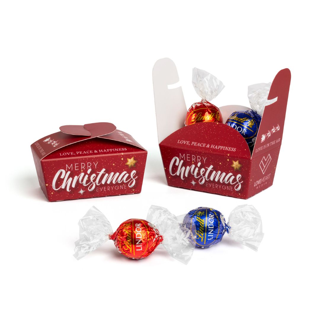 Das Lindt Lindor X-Mas Ballotin ist das perfekte Geschenk zur Weihnachtszeit und vereint Genuss mit deiner individuellen Markenpräsentation. Das Produkt enthält zwei feinste Lindt Lindor Kugeln, die nach deiner Wahl verpackt werden, entweder in der Geschmacksrichtung Milchschokolade (Rot), Schokolade feinherb (Blau) oder in einer gemischten Auswahl.