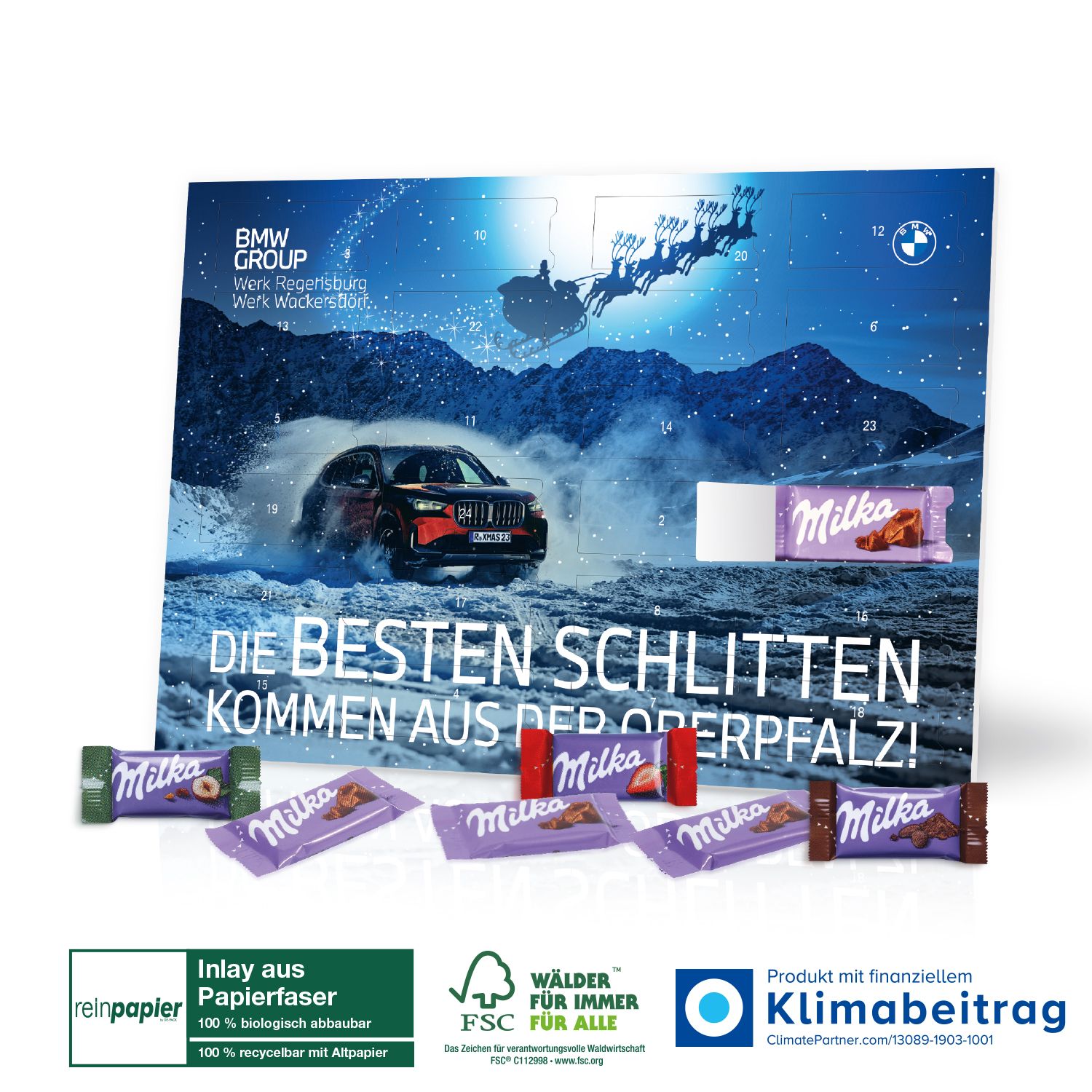 Der Tisch-Adventskalender Organic mit Milka Schokolade Mix ist das ideale nachhaltige Werbegeschenk für deine KundInnen und MitarbeiterInnen in der festlichen Jahreszeit. Mit 24 köstlichen Milka Schokoladenstückchen in verschiedenen Geschmacksrichtungen – darunter die beliebten Sorten Alpenmilch, Haselnuss, Crème au Cacao und Erdbeere – bietet dieser Adventskalender ein abwechslungsreiches und schmackhaftes Erlebnis. Mit einem Produktgewicht von ca. 110 g ist der Kalender perfekt für eine süße Überraschung während der Vorweihnachtszeit.