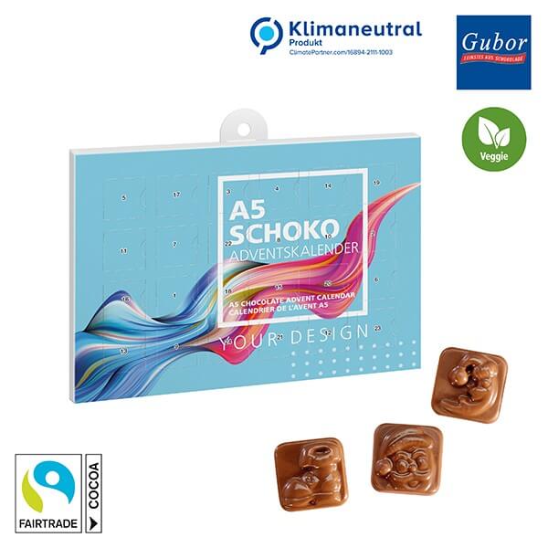 Die Weihnachtszeit versüßen mit dem A5 Schokoladen Adventskalender. 24 Tage eine Freude an Kund*Innen oder Mitarbeiter*Innen verschenken mit der Fairtrade Schokolade von Gubor. Der Adventskalender ist im FSC-zertifiziertem Karton verpackt. Präsenter werben als mit dem Adventskalender geht es nicht. Der 207 x 146 mm große Adventskalender gibt dir mit dem 4-farbigem Digitaldruck deinen Vorstellungen Platz die Vorderseite nach deinen Wünschen zu bedrucken. Made in Germany. Gestalte deinen A5 Schokoladen Adventskalender ganz individuell!