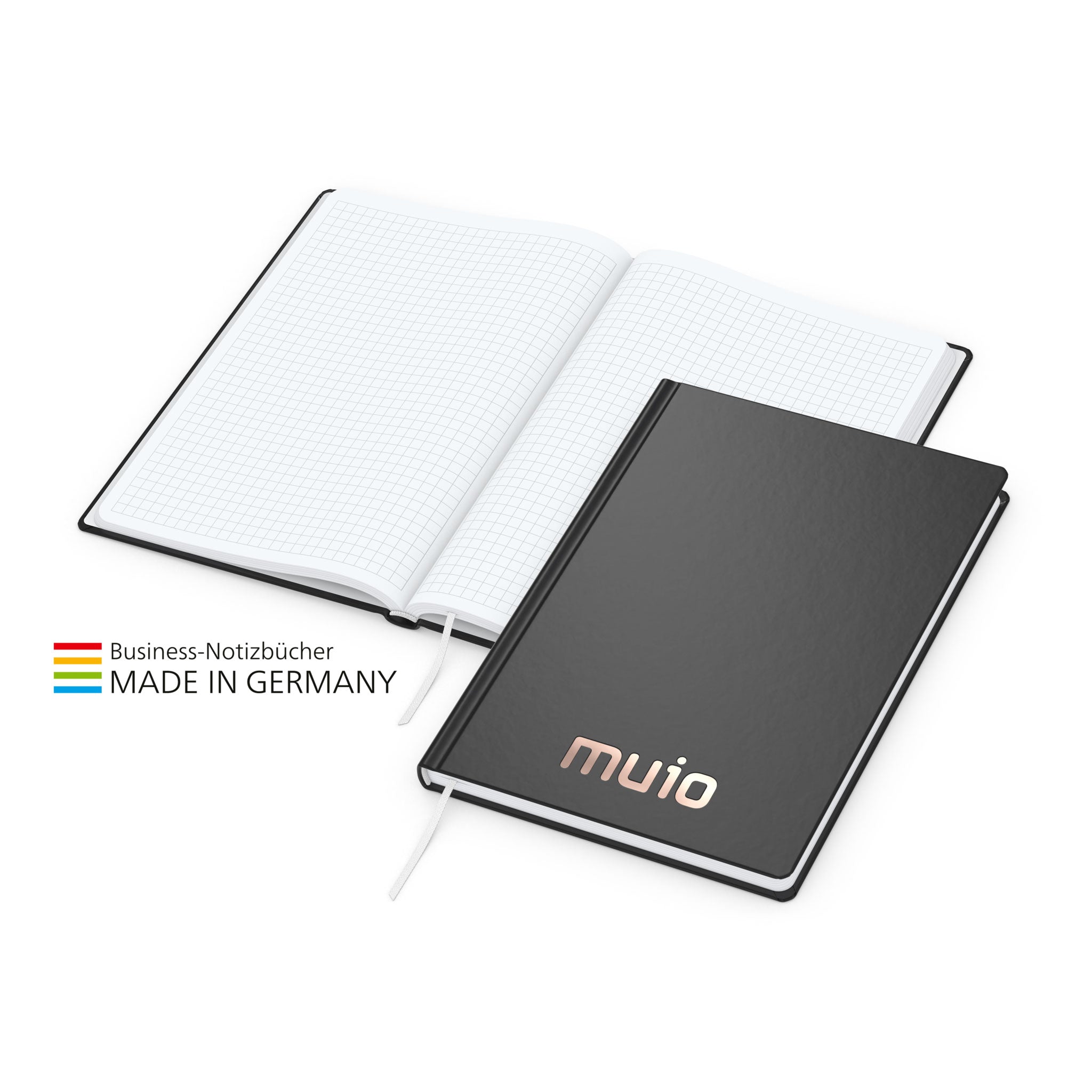 Mit diesem Notizbuch mit mattem Hardcover überzeugst du deine Kund*Innen und Mitarbeiter*Innen. Mit 192 karierten Seiten ist genug Platz alles zu notieren, was einem in den Kopf kommt, zusätzlich kannst du zwischen 3 Größen auswählen. Das Lesezeichen erinnert dich das nächste Mal an welcher Stelle du stehen geblieben bist. Die Individualisierung erfolgt durch Prägung auf das Außenband des Notizbuches. Perfekter Werbeartikel für Konferenzen und Messen. Gestalte jetzt dein Hardcover Notizbuch!