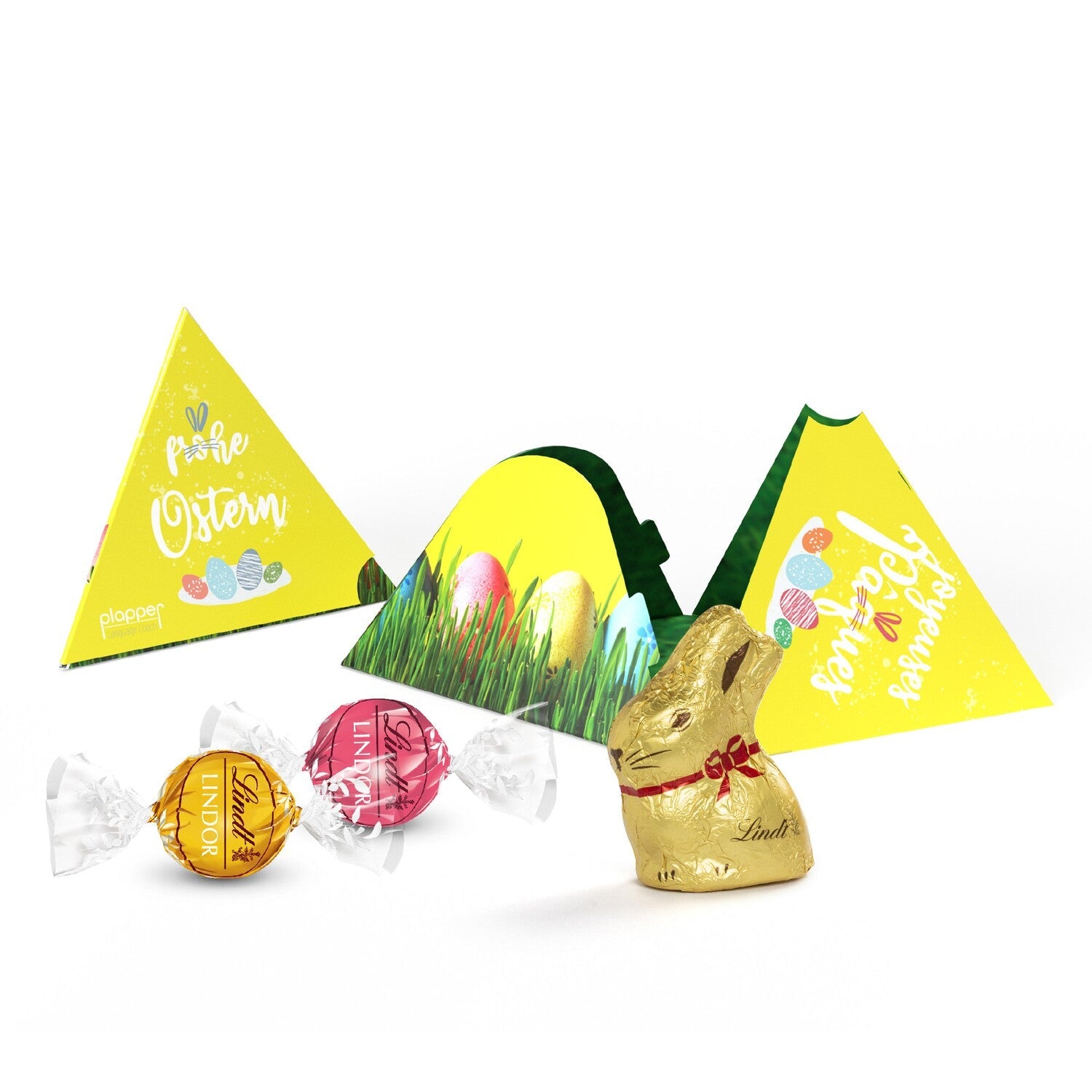Das Osternest in der Pyramidenbox ist ein echter Eyecatcher. Die Kartonage aus FSC®-zertifiziertem Karton ist gefüllt mit einem leckeren Lindt Osterhäschen und zwei Lindt Lindor Kugeln. Die Kartonage ist auch von innen im Design eines Nests bedruckbar. Im Digitaldruckverfahren können wir dein Design in mehreren Farben umsetzen und auf die Seiten der Pyramide drucken. Auch eine individuelle Werbebotschaft mit deinem Logo stellen kein Problem dar. Versüße jetzt das Osterfest deiner Kund:innen und Mitarbeiter:innen mit der Osternest-Pyramidenbox.