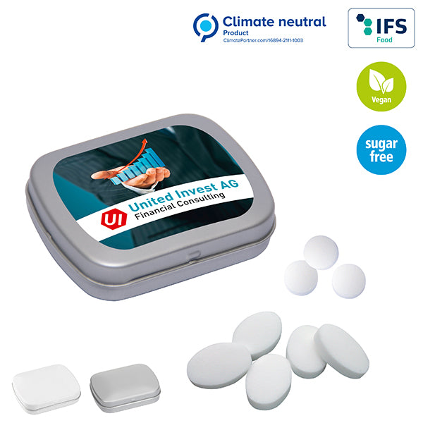 Nachhaltige Werbeartikel im recycelbarer Metalldose mit zuckerfreien Pfefferminzpastillen gefüllt. Die Mini-Klappdose hat die perfekte Größe für unterwegs. Die Aufreißhilfe an der Dose erleichtert das erste Öffnen. Die Dose ist auf dem Deckel individuell bedruckbar mit dem 4-farbigen Digitaldruck. In Deutschland hergestellt. Auch als Expressversion möglich und innerhalb von 2 Wochen genießen. Die Mini-Klappdose mit zuckerfreien Pfefferminzpastillen ist wiederverwendbar. Gestalte deine Mini-Klappdose!