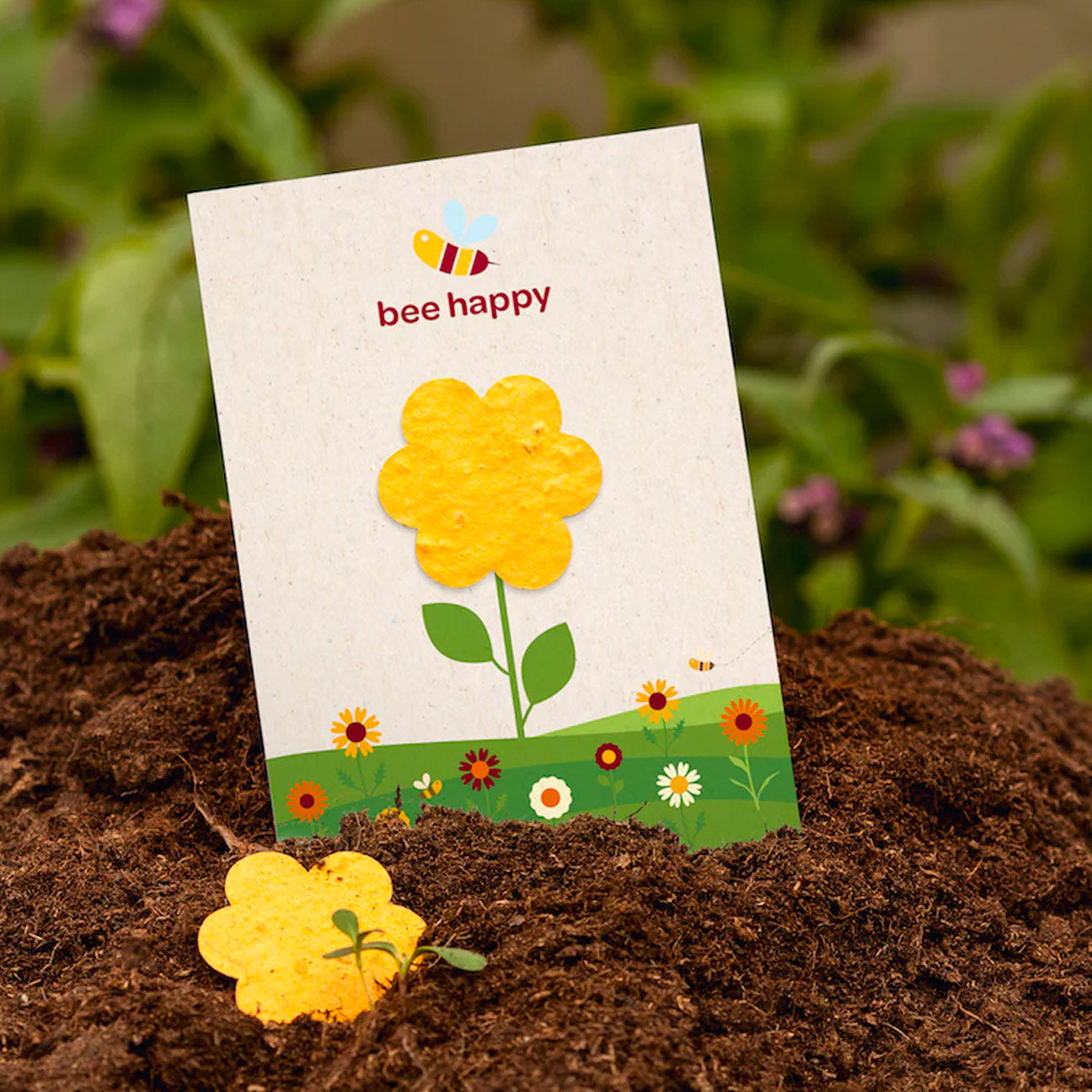 Samenpapier in Postkarten Format für deine Werbezwecke. Die Postkarte hat Blumensamen im Papier verarbeitet, die einfach in die Erde gelegt werden. Nach kurzer Zeit wachsen Blumen und die Kund*Innen und Mitarbeiter*Innen werden staunen und an euch denken. Die Postkarte individuell bedrucken mit deiner Werbebotschaft. Die Druckfläche beträgt die Maße 146 x 103 mm. Perfekt für Grüße zu besonderen Anlässen wie Feiertage oder Geburtstagsgrüße. Gestalte deine Samenpapier Postkarte nach deinen Vorstellungen.